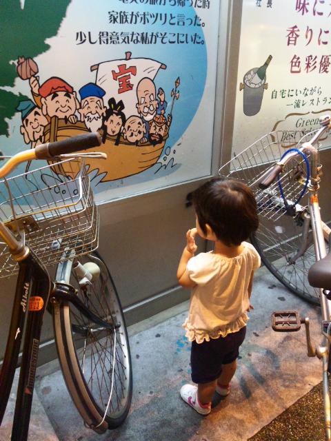 買い物が終わり外に出ると、チャーはいつも、スーパー壁面の七福神のイラストに見入ります。