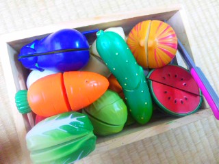 そのずーっと前に買った、ちょっとお高めの、木でできたマグネット式の野菜よりウケがいいです。