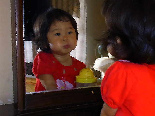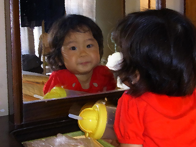 鏡の前に来たらただ笑うだけだったのが、いまでは鏡の前でいろんな顔をして遊ぶようになりました。