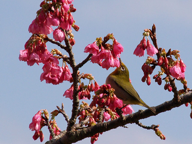 最近ちらほらと咲きはじめたサクラと、蜜を吸いに来たメジロ。