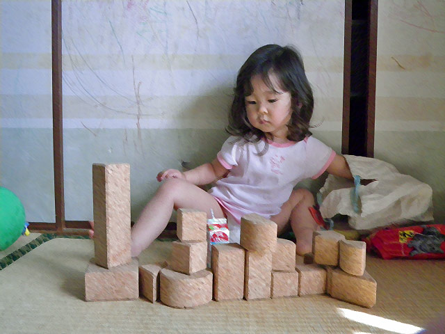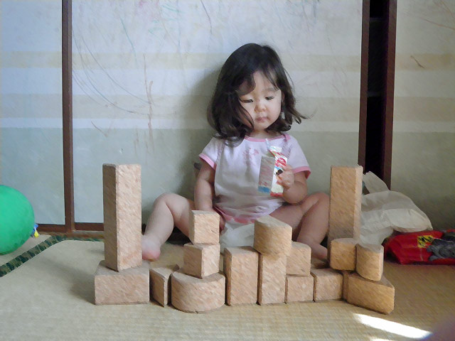 自らのアート作品(という名の落書き(ノД`))をバックに積み木で遊ぶチャーさん。