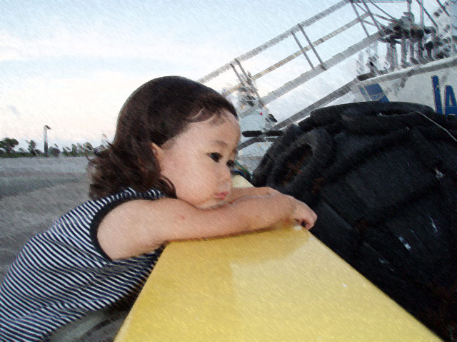 (さすがに少し飽きて、船から排水される水を眺めるチャー)