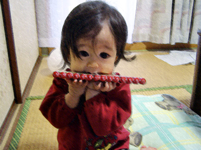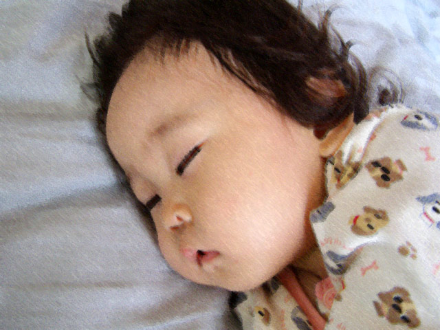 この数日真昼の気温が高いので、窓開けっ放しで寝ていたのですが、その開いている窓から外を見て奇声を上げたり、いびきかいて寝ているオットに自分のぬいぐるみをプレゼントしたり(笑)、わたしにだっこを要求したり、眠る気配がまったくありません。