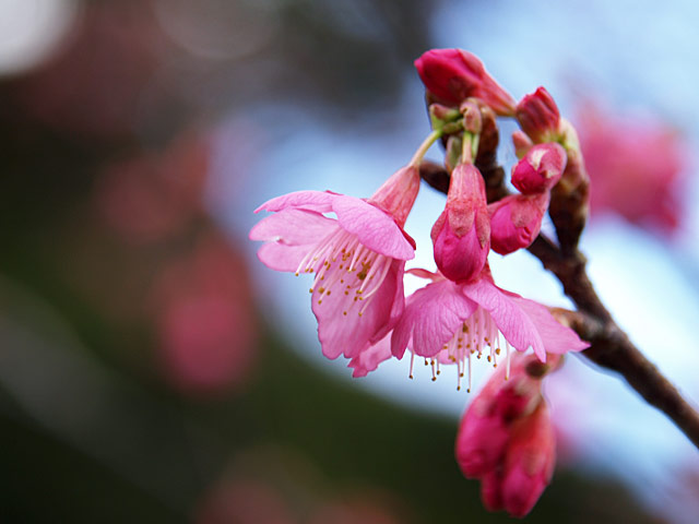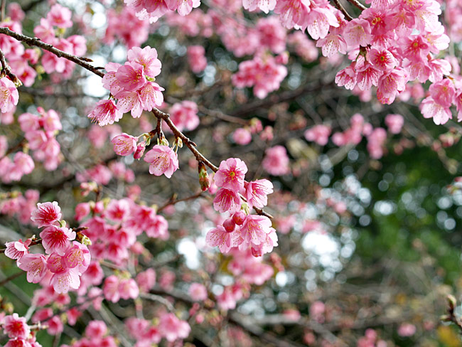 八分咲きのもの、まだ蕾しかついていないもの、満開を超えて葉が出てきたもの、いろいろな木があります。