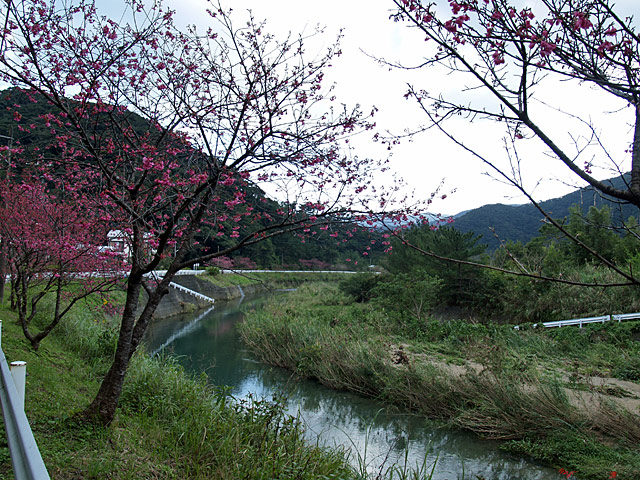 島の中間部にある集落内の桜並木なのですが、途中途切れつつも確実に1kmは延々とヒカンザクラが植わっておりました。